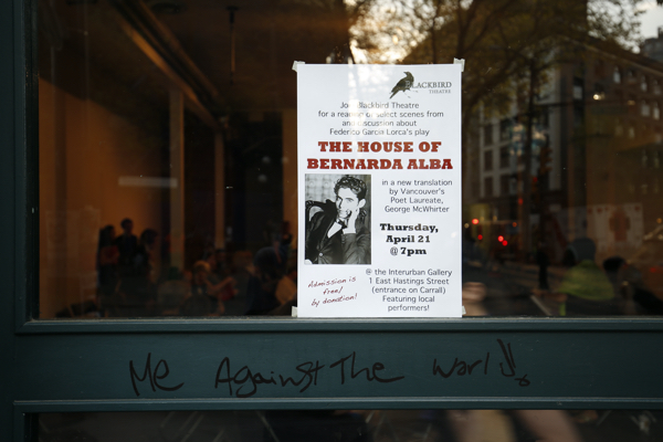 This workshop and reading in Vancouver’s Downtown East Side was organized by Luisa Jojic and directed by Rachel Peake.